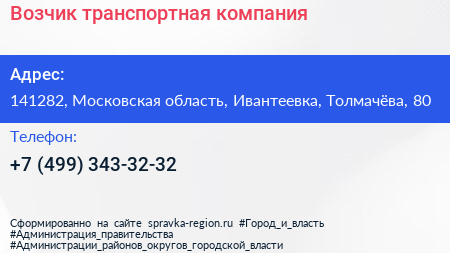 Возчик, транспортная компания по адресу 141282, Московская область, Ивантеевка, Толмачёва, 80 в дальнейшем Организация, размещена в следующих категориях:
