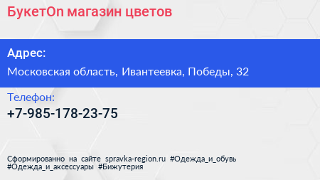 БукетOn, магазин цветов по адресу Московская область, Ивантеевка, Победы, 32 в дальнейшем Организация, размещена в следующих категориях: