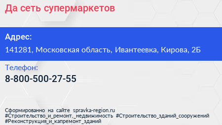 Да!, сеть супермаркетов по адресу 141281, Московская область, Ивантеевка, Кирова, 2Б в дальнейшем Организация, размещена в следующих категориях: