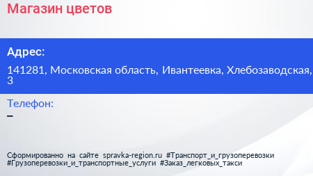 Магазин цветов по адресу 141281, Московская область, Ивантеевка, Хлебозаводская, 3 в дальнейшем Организация, размещена в следующих категориях: