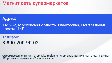 Магнит, сеть супермаркетов по адресу 141282, Московская область, Ивантеевка, Центральный проезд, 14Б в дальнейшем Организация, размещена в следующих категориях: