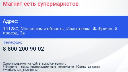 Магнит, сеть супермаркетов по адресу 141280, Московская область, Ивантеевка, Фабричный проезд, 3а в дальнейшем Организация, размещена в следующих категориях: