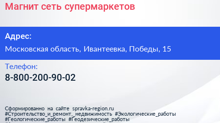 Магнит, сеть супермаркетов по адресу Московская область, Ивантеевка, Победы, 15 в дальнейшем Организация, размещена в следующих категориях: