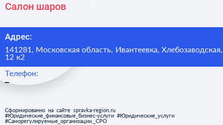Салон шаров по адресу 141281, Московская область, Ивантеевка, Хлебозаводская, 12 к2 в дальнейшем Организация, размещена в следующих категориях: