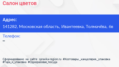 Салон цветов по адресу 141282, Московская область, Ивантеевка, Толмачёва, 6в в дальнейшем Организация, размещена в следующих категориях: