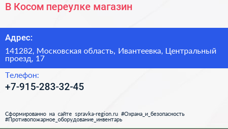 В Косом переулке, магазин по адресу 141282, Московская область, Ивантеевка, Центральный проезд, 17 в дальнейшем Организация, размещена в следующих категориях: