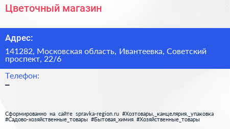 Цветочный магазин по адресу 141282, Московская область, Ивантеевка, Советский проспект, 22/6 в дальнейшем Организация, размещена в следующих категориях: