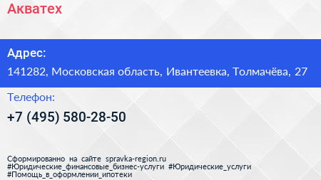Акватех по адресу 141282, Московская область, Ивантеевка, Толмачёва, 27 в дальнейшем Организация, размещена в следующих категориях: