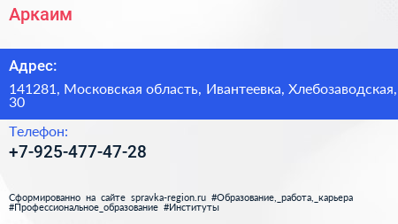 Аркаим по адресу 141281, Московская область, Ивантеевка, Хлебозаводская, 30 в дальнейшем Организация, размещена в следующих категориях:
