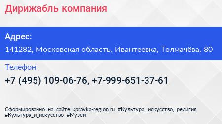 Для связи с организацией воспользуйтесь номером телефона: +7 (495) 109-06-76, +7-999-651-37-61. Ежедневно с 09:00 до 21:00, вы можете обратиться в эту организацию.