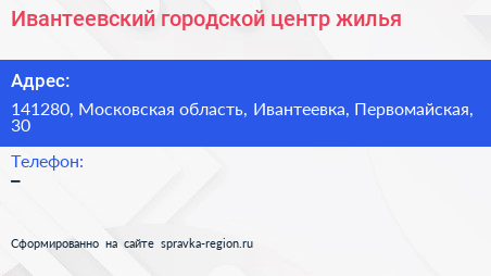 Ивантеевский городской центр жилья по адресу 141280, Московская область, Ивантеевка, Первомайская, 30 в дальнейшем Организация, размещена в следующих категориях: