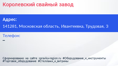 Королевский свайный завод по адресу 141281, Московская область, Ивантеевка, Трудовая, 3 в дальнейшем Организация, размещена в следующих категориях:
