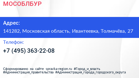 МОСОБЛБУР по адресу 141282, Московская область, Ивантеевка, Толмачёва, 27 в дальнейшем Организация, размещена в следующих категориях: