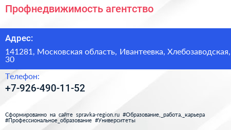 Профнедвижимость, агентство по адресу 141281, Московская область, Ивантеевка, Хлебозаводская, 30 в дальнейшем Организация, размещена в следующих категориях: