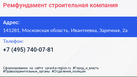 Ремфундамент, строительная компания по адресу 141281, Московская область, Ивантеевка, Заречная, 2а в дальнейшем Организация, размещена в следующих категориях: