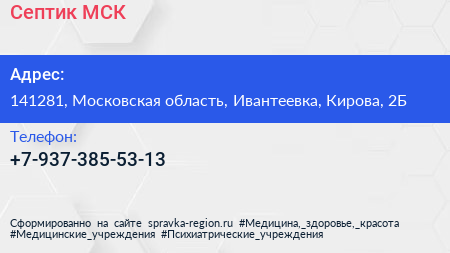 Септик МСК по адресу 141281, Московская область, Ивантеевка, Кирова, 2Б в дальнейшем Организация, размещена в следующих категориях: