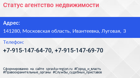 Статус, агентство недвижимости по адресу 141280, Московская область, Ивантеевка, Луговая, 3 в дальнейшем Организация, размещена в следующих категориях: