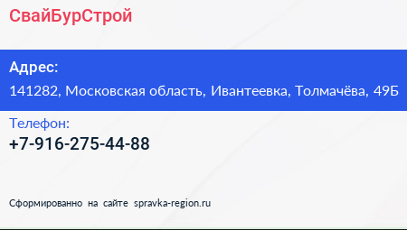 СвайБурСтрой по адресу 141282, Московская область, Ивантеевка, Толмачёва, 49Б в дальнейшем Организация, размещена в следующих категориях: