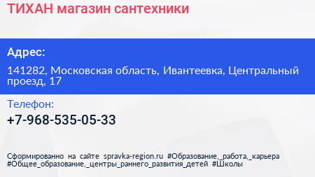 ТИХАН, магазин сантехники по адресу 141282, Московская область, Ивантеевка, Центральный проезд, 17 в дальнейшем Организация, размещена в следующих категориях: