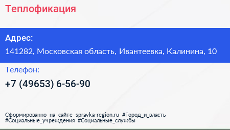 Теплофикация по адресу 141282, Московская область, Ивантеевка, Калинина, 10 в дальнейшем Организация, размещена в следующих категориях: