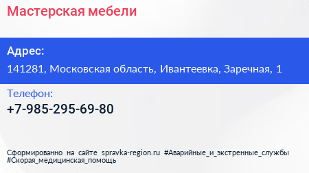 Мастерская мебели по адресу 141281, Московская область, Ивантеевка, Заречная, 1 в дальнейшем Организация, размещена в следующих категориях: