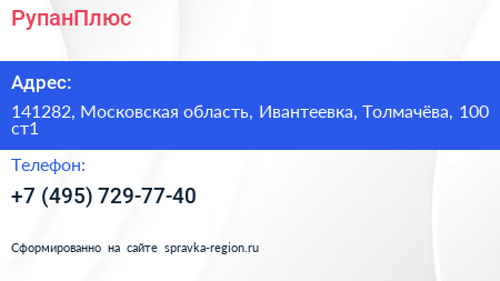 РупанПлюс по адресу 141282, Московская область, Ивантеевка, Толмачёва, 100 ст1 в дальнейшем Организация, размещена в следующих категориях: