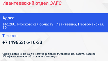 Ивантеевский отдел ЗАГС по адресу 141280, Московская область, Ивантеевка, Первомайская, 19 в дальнейшем Организация, размещена в следующих категориях: