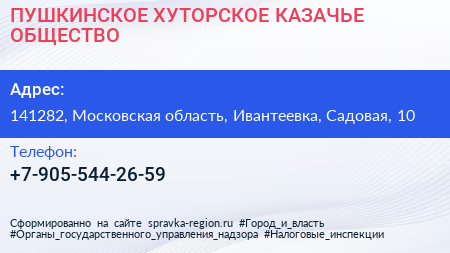 ПУШКИНСКОЕ ХУТОРСКОЕ КАЗАЧЬЕ ОБЩЕСТВО по адресу 141282, Московская область, Ивантеевка, Садовая, 10 в дальнейшем Организация, размещена в следующих категориях: