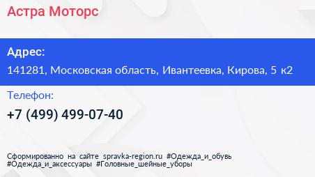 Астра Моторс по адресу 141281, Московская область, Ивантеевка, Кирова, 5 к2 в дальнейшем Организация, размещена в следующих категориях:
