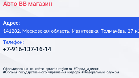 Авто ВВ, магазин по адресу 141282, Московская область, Ивантеевка, Толмачёва, 27 к1 в дальнейшем Организация, размещена в следующих категориях: