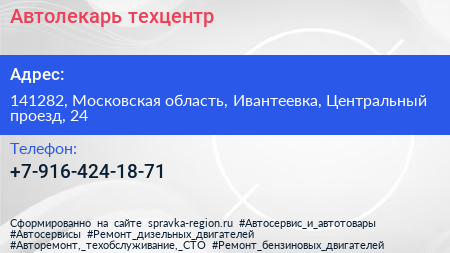 Автолекарь, техцентр по адресу 141282, Московская область, Ивантеевка, Центральный проезд, 24 в дальнейшем Организация, размещена в следующих категориях: