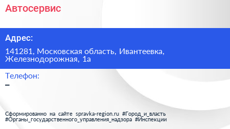 Автосервис по адресу 141281, Московская область, Ивантеевка, Железнодорожная, 1а в дальнейшем Организация, размещена в следующих категориях: