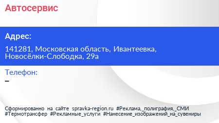 Автосервис по адресу 141281, Московская область, Ивантеевка, Новосёлки-Слободка, 29а в дальнейшем Организация, размещена в следующих категориях: