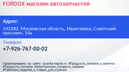 FORDOX, магазин автозапчастей по адресу 141282, Московская область, Ивантеевка, Советский проспект, 14а в дальнейшем Организация, размещена в следующих категориях: