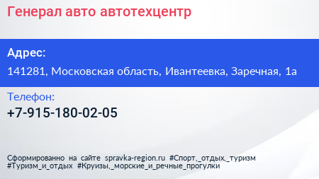 Генерал-авто, автотехцентр по адресу 141281, Московская область, Ивантеевка, Заречная, 1а в дальнейшем Организация, размещена в следующих категориях:
