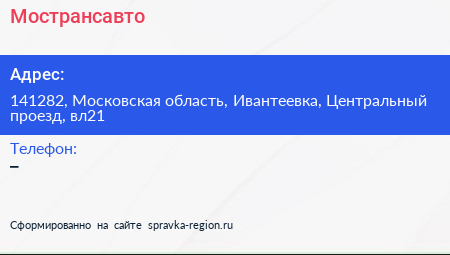 Мострансавто по адресу 141282, Московская область, Ивантеевка, Центральный проезд, вл21 в дальнейшем Организация, размещена в следующих категориях: