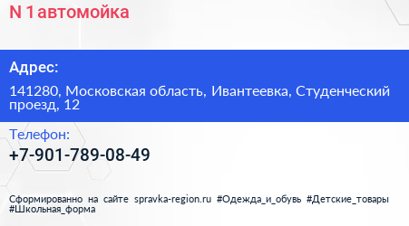 N-1, автомойка по адресу 141280, Московская область, Ивантеевка, Студенческий проезд, 12 в дальнейшем Организация, размещена в следующих категориях: