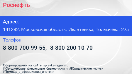 Роснефть по адресу 141282, Московская область, Ивантеевка, Толмачёва, 27а в дальнейшем Организация, размещена в следующих категориях: