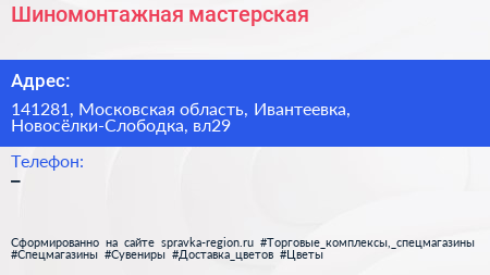 Шиномонтажная мастерская по адресу 141281, Московская область, Ивантеевка, Новосёлки-Слободка, вл29 в дальнейшем Организация, размещена в следующих категориях:
