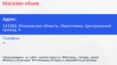 Магазин обоев по адресу 141282, Московская область, Ивантеевка, Центральный проезд, 4 в дальнейшем Организация, размещена в следующих категориях: