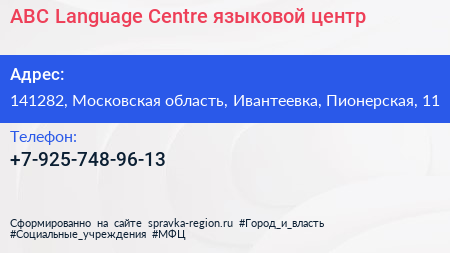 ABC Language Centre, языковой центр по адресу 141282, Московская область, Ивантеевка, Пионерская, 11 в дальнейшем Организация, размещена в следующих категориях: