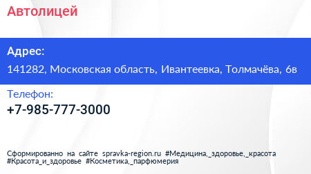 Автолицей по адресу 141282, Московская область, Ивантеевка, Толмачёва, 6в в дальнейшем Организация, размещена в следующих категориях: