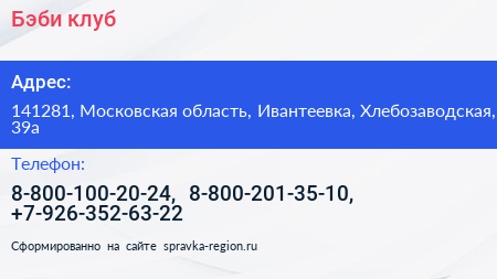 Бэби-клуб по адресу 141281, Московская область, Ивантеевка, Хлебозаводская, 39а в дальнейшем Организация, размещена в следующих категориях: