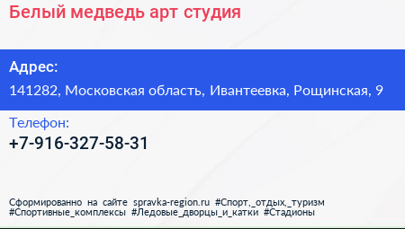 Белый медведь, арт-студия по адресу 141282, Московская область, Ивантеевка, Рощинская, 9 в дальнейшем Организация, размещена в следующих категориях: