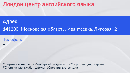 Лондон, центр английского языка по адресу 141280, Московская область, Ивантеевка, Луговая, 2 в дальнейшем Организация, размещена в следующих категориях:
