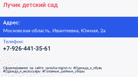 Лучик, детский сад по адресу Московская область, Ивантеевка, Южная, 2а в дальнейшем Организация, размещена в следующих категориях: