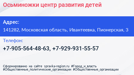 Осьминожки, центр развития детей по адресу 141282, Московская область, Ивантеевка, Пионерская, 3 в дальнейшем Организация, размещена в следующих категориях: