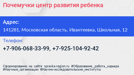 Почемучки, центр развития ребенка по адресу 141281, Московская область, Ивантеевка, Школьная, 12 в дальнейшем Организация, размещена в следующих категориях: