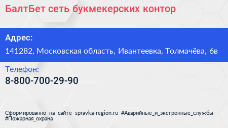 БалтБет, сеть букмекерских контор по адресу 141282, Московская область, Ивантеевка, Толмачёва, 6в в дальнейшем Организация, размещена в следующих категориях: