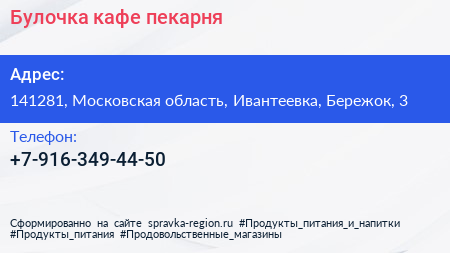 Булочка, кафе-пекарня по адресу 141281, Московская область, Ивантеевка, Бережок, 3 в дальнейшем Организация, размещена в следующих категориях: